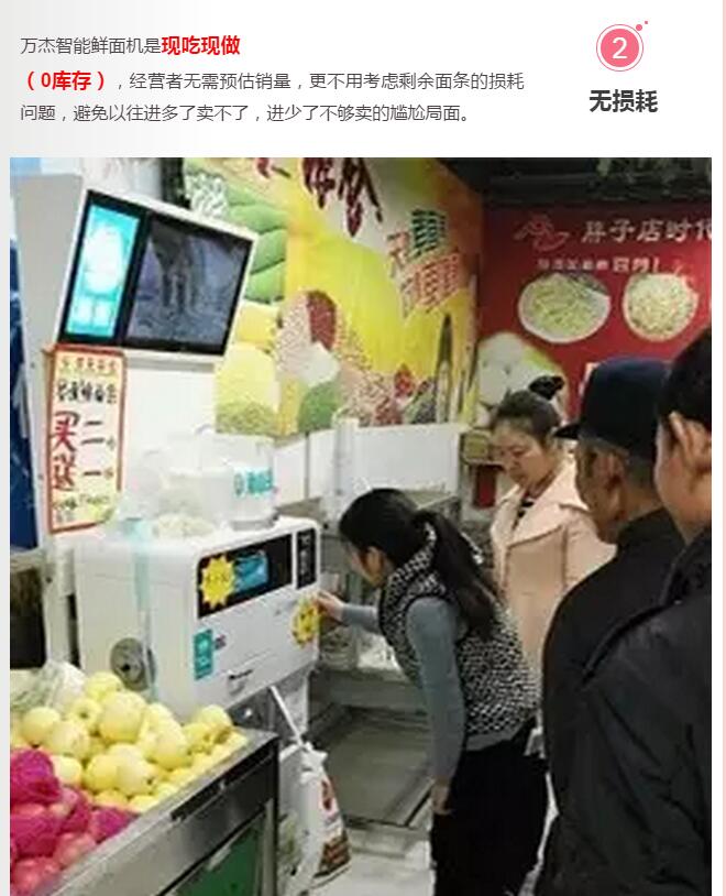 万杰智能鲜面机,一键启动,8秒出面,因为现吃现做,所以无需运输,无需储存,制作全程0添加。消费者放心买,销售者放心卖。 如今,万杰智能鲜面机已成为超市的热点项目,尤其对于社区超市,万杰智能鲜面机有着巨大优势: 目前,智能鲜面机已经在北京、河北、河南面世, 全国10万台铺设活动正在进行! 引爆呼市正在启动,快快联系我们吧! 欢迎拨打商务合作热线:18686038613 万杰智能鲜面机受到农业部、央视等行业权威机构、媒体的广泛关注 |