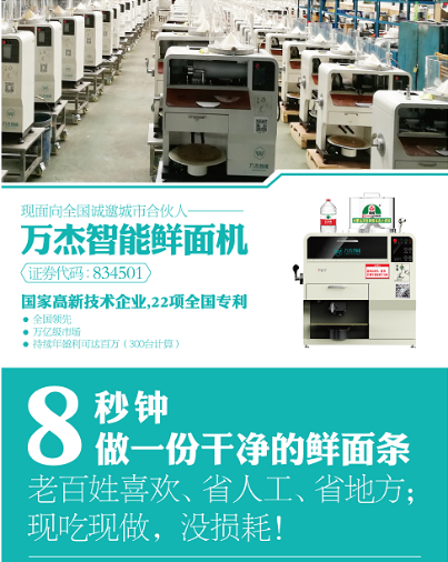 2017年6月23日-25日,万杰智能将携手惠每家参加在山东潍坊举办的“2017亚洲调理食材大会暨创新产品展”。紧接着,2017年6月26日-28日,在江苏张家港参加 “中酱杯”全国餐饮酒店业首脑CEO峰会。届时,欢迎有意向的城市合伙人以及餐饮终端伙伴们莅临万杰展位进行参观洽谈。 万杰智能鲜面机“现吃现做,8秒出面”,拥有22项专利,全国首创,已在北京、河北、河南、内蒙、吉林、甘肃等地面世,得到了消费者的一致认可与好评。本次展会,智能鲜面机将再一次与全国意向合作伙伴们“见面”。如果您是餐饮界“大咖”,拥有丰富的餐饮资源,智能鲜面机持续的盈利空间以及万亿级的市场前景,可能是您愿意尝试的好项目。如果您是快餐店、面馆、火锅店等餐饮终端的老板,智能鲜面机不仅可以帮您节省人工,获得更多利润,同时全透明的制面过程,还可以吸引更多客流。 8秒做一份干净的鲜面条,让制作过程在百姓的“眼皮”下进行,这一保障主食安全的创新之举,这份关乎亿万家庭主食安全的事业,需要更多有识之士共同参与才可发展壮大!本次潍坊,张家港两个展会,不仅将产业、商业、学界大咖共聚一堂,还聚集了来自全国的餐饮精英,万杰智能期待有着共同事业理想的伙伴们前来咨询,我们等着你,不见不散! 展会信息: 1、 2017亚洲调理食材大会暨创新产品展 时间:6月23-25日 地点:山东潍坊福环国际展览中心 2、“中酱杯”全国餐饮酒店业首脑CEO峰会 时间:6月26-28日 地点:苏州张家港国贸酒店 |
