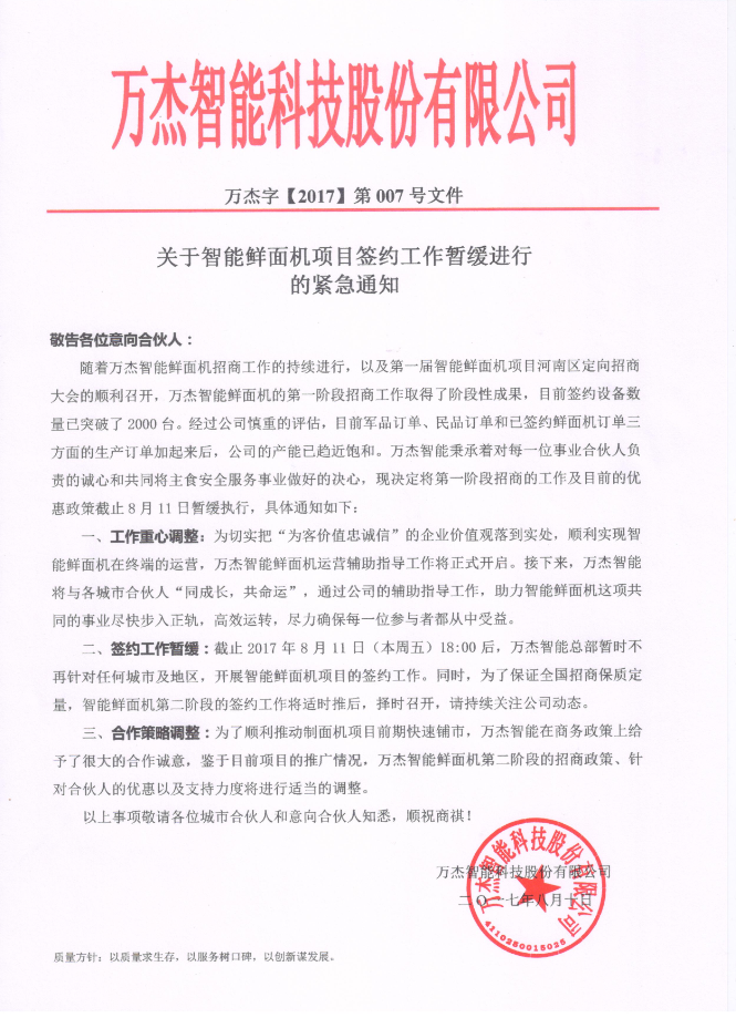 敬告各位意向合伙人: 随着万杰智能鲜面机招商工作的持续进行,以及第一届智能鲜面机项目河南区定向招商大会的顺利召开,万杰智能鲜面机的第一阶段招商工作取得了阶段性成果,目前签约设备数量已突破了2000台。经过公司慎重的评估,目前军品订单、民品订单和已签约鲜面机订单三方面的生产订单加起来后,公司的产能已趋近饱和。万杰智能秉承着对每一位事业合伙人负责的诚心和共同将主食安全服务事业做好的决心,现决定将第一阶段招商的工作及目前的优惠政策截止8月11日暂缓执行,具体通知如下: 一、工作重心调整:为切实把“为客价值忠诚信”的企业价值观落到实处,顺利实现智能鲜面机在终端的运营,万杰智能鲜面机运营辅助指导工作将正式开启。接下来,万杰智能将与各城市合伙人“同成长,共命运”,通过公司的辅助指导工作,助力智能鲜面机这项共同的事业尽快步入正轨,高效运转,尽力确保每一位参与者都从中受益。 二、签约工作暂缓:截止2017年8月11日(本周五)18:00后,万杰智能总部暂时不再针对任何城市及地区,开展智能鲜面机项目的签约工作。同时,为了保证全国招商保质定量,智能鲜面机第二阶段的签约工作将适时推后,择时召开,请持续关注公司动态。 三、合作策略调整:为了顺利推动制面机项目前期快速铺市,万杰智能在商务政策上给予了很大的合作诚意,鉴于目前项目的推广情况,万杰智能鲜面机第二阶段的招商政策、针对合伙人的优惠以及支持力度将进行适当的调整。 以上事项敬请各位城市合伙人和意向合伙人知悉,顺祝商祺!