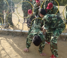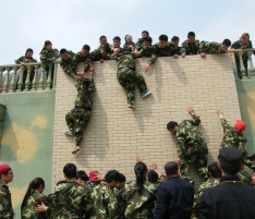 毕业墙:每个人都要翻越一堵大约4米且垂直的围墙,这又是一个必须依靠集体的力量才能完成的项目。刚开始,大家都认为这是很难完成而且比较危险的任务,估计需要半个小时,甚至一个小时才能全部通过。 通过集思广益,我们拟定了计划,采用“叠人墙”的方法,让身强力壮的队员作为底座,先由两三位队员踩在他们的肩膀,大家奋力将他们先托上高墙,然后他们在上面接应,其他同伴踩着底座同伴的肩膀,一个一个成功地翻越了高墙。整个过程历时不过5分钟,活动结束后,所有队员都为自己和团队的精彩表现鼓掌、欢呼,那一刻的场面激动人心! 此项目心得体会:首先要感谢作为底座的几位队友,十几个同伴踩在他们的肩膀上,汗水、沙土粘满了衣服,肩膀被踩出红红的血痕。他们的奉献和付出,换来了团队的成功。无论在工作还是生活中,只有放下自私、愿意付出、为别人着想、才能成就自己,完成目标。