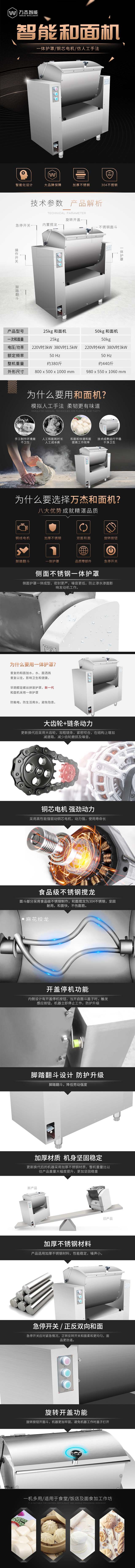 产品型号:WJ-HMJ25A 一次和面量:25KG 额定电压:380V 功 率:1.8KW 外形尺寸:850x500x1000MM 机器重量:190KG