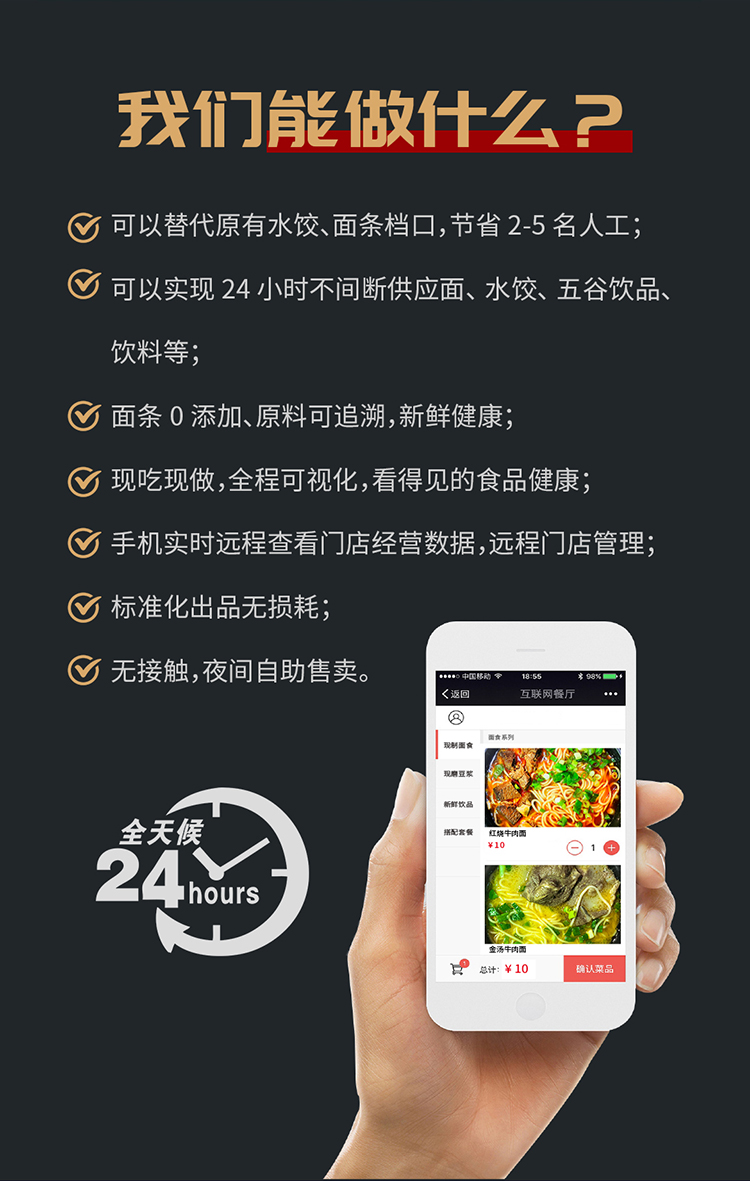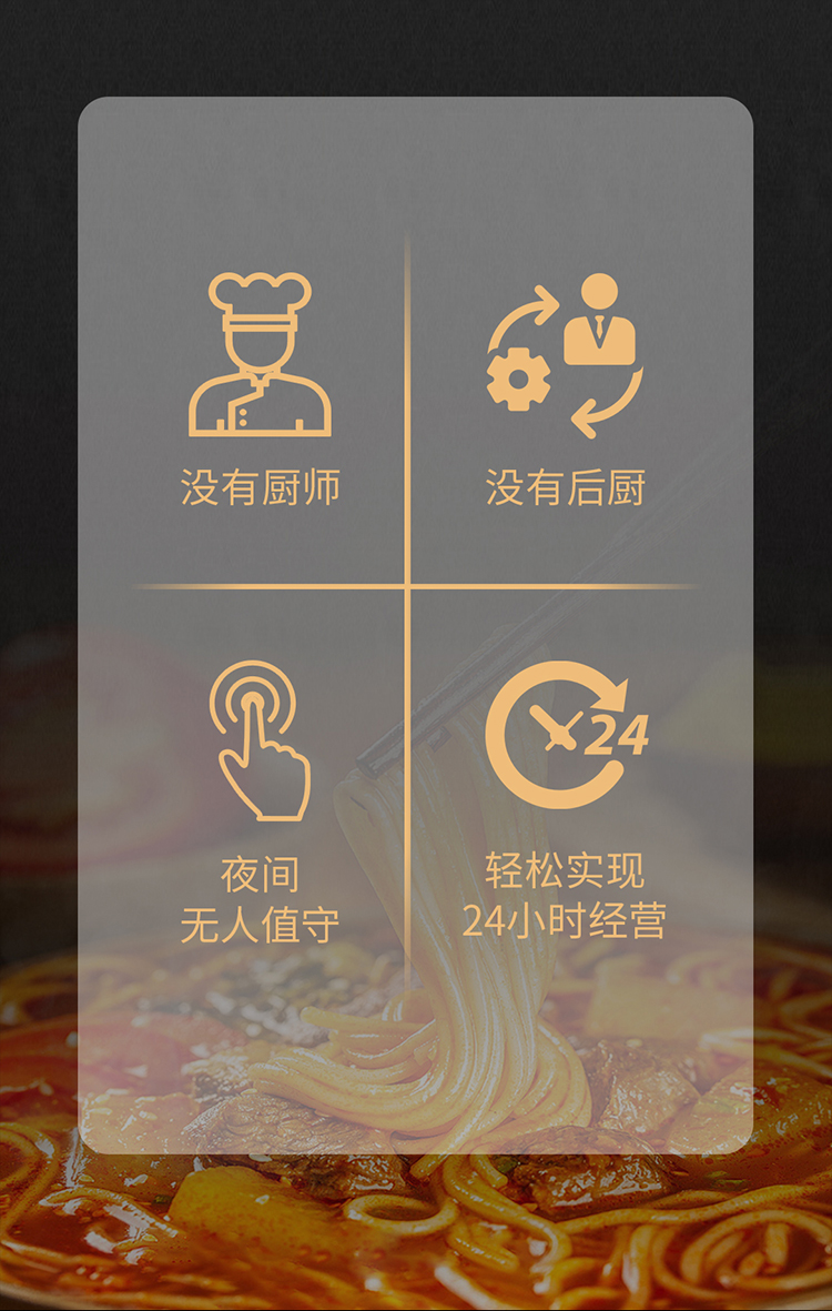 • 可以实现24小时不间断供应面、水饺、五谷饮品、饮料等;